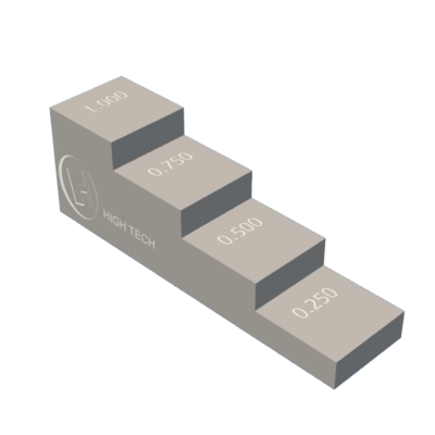 The 4-step block is used to gauge thickness and linearity. The steps are 0.250″/6.25mm, 0.500″/1205mm, 0.750″/18.75mm and 1.000″/25mm thick with each step face measuring 0.750 “x0.750″/20mmx20mm. The block is manufactured in accordance with ASTM E797. If needed, we offer customization for additional and larger steps.