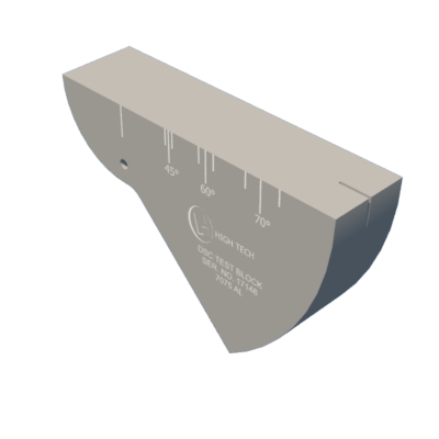 The DSC block is used to calibrate the sensitivity and distance of the shear wave on ultrasonic equipment. With a 1.0″ radius and a 3.0″ radius on opposite faces, the block has a slot spaced .484″ from the flat surface, with a 3.0″ radius machined .375″ deep. The block includes a 0° reference pattern to check the exit point on the wedge, a 1/8″ diameter through hole spaced ¾” from the flat surface, and 45°, 60° and 70° marks to measure the actual refraction angle.