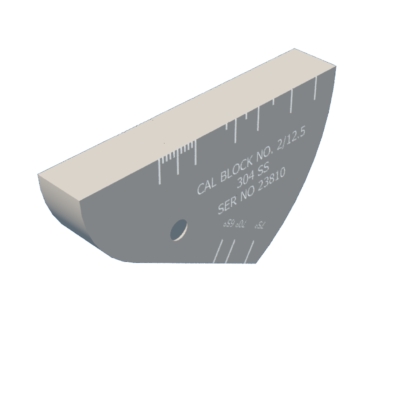 Used for on-site checking of index, time base, beam angle and gain of miniature shear wave probe. Manufactured in accordance with EN 27963, DIN 54-120 and ISO 7963. Marking present on both sides of the block. 12.5 mm thickness.