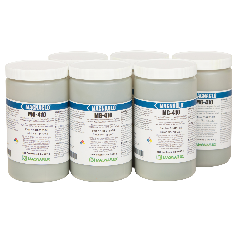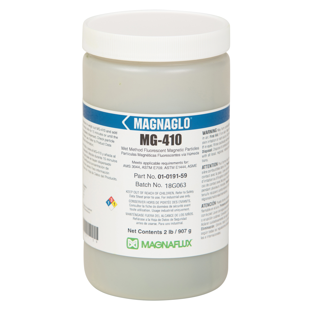 MG-410 is an ultra-bright fluorescent magnetic particle powder for locating small, medium, and large discontinuities. These particles provide clear, ultra-bright, fluorescent green indications under UV light with minimal background. MG-410 is designed for use in water or oil baths for wet method fluorescent magnetic particle testing.