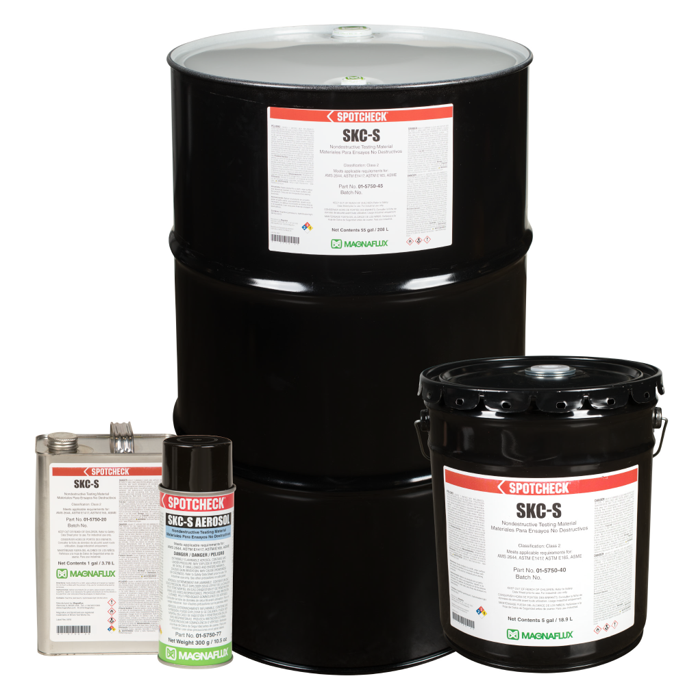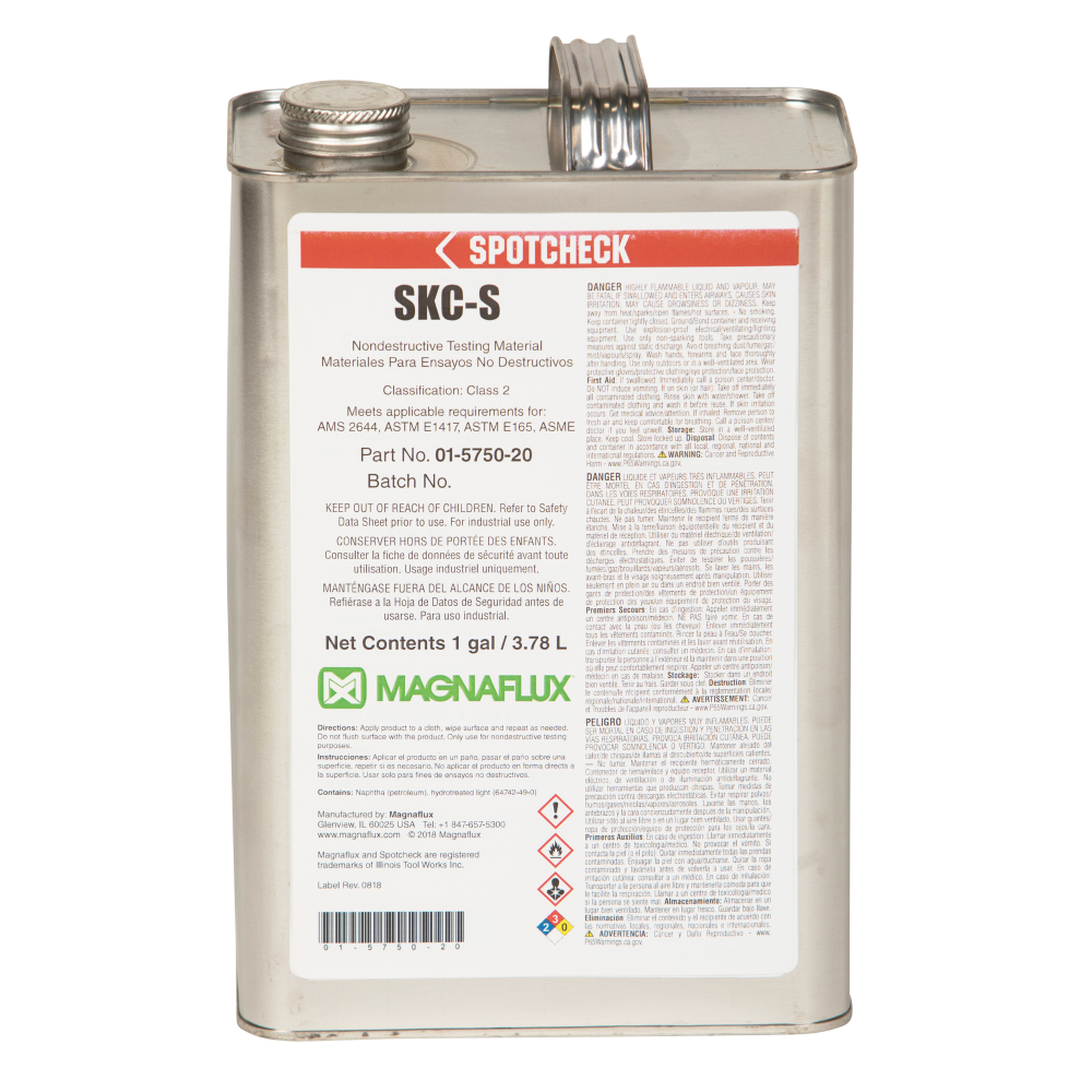 SKC-S is an NDT-approved solvent cleaner/remover for pre-cleaning before non-destructive testing and for removing excess surface penetrant from an inspection area before applying developer during liquid penetrant testing.