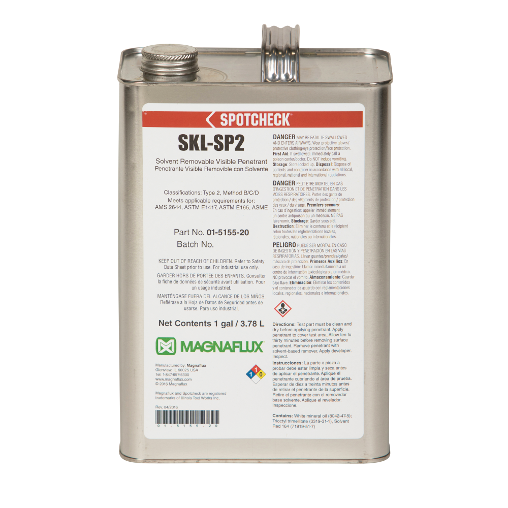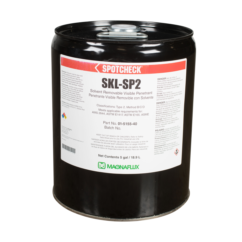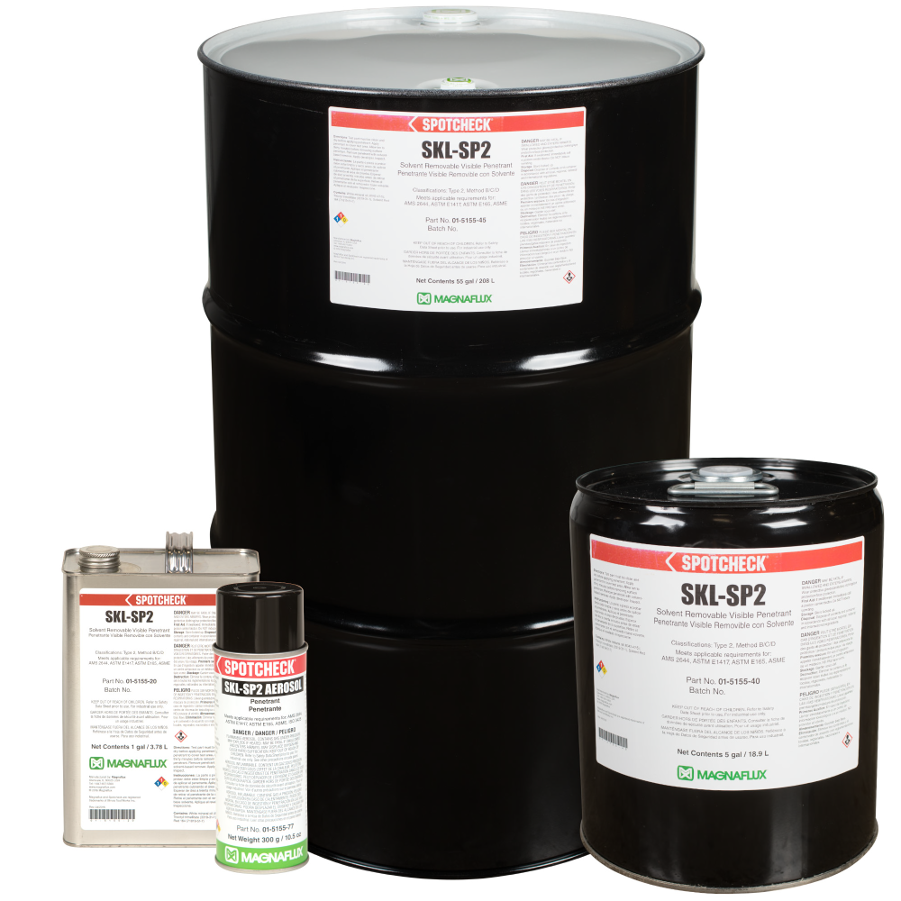 SKL-SP2 is a solvent removable visible red dye penetrant. SKL-SP2 locates surface-breaking discontinuities with a simple three-step process that is ideal for basic industrial nondestructive testing. SKL-SP2 features high-performance penetrating characteristics and produces clear vivid red indications.