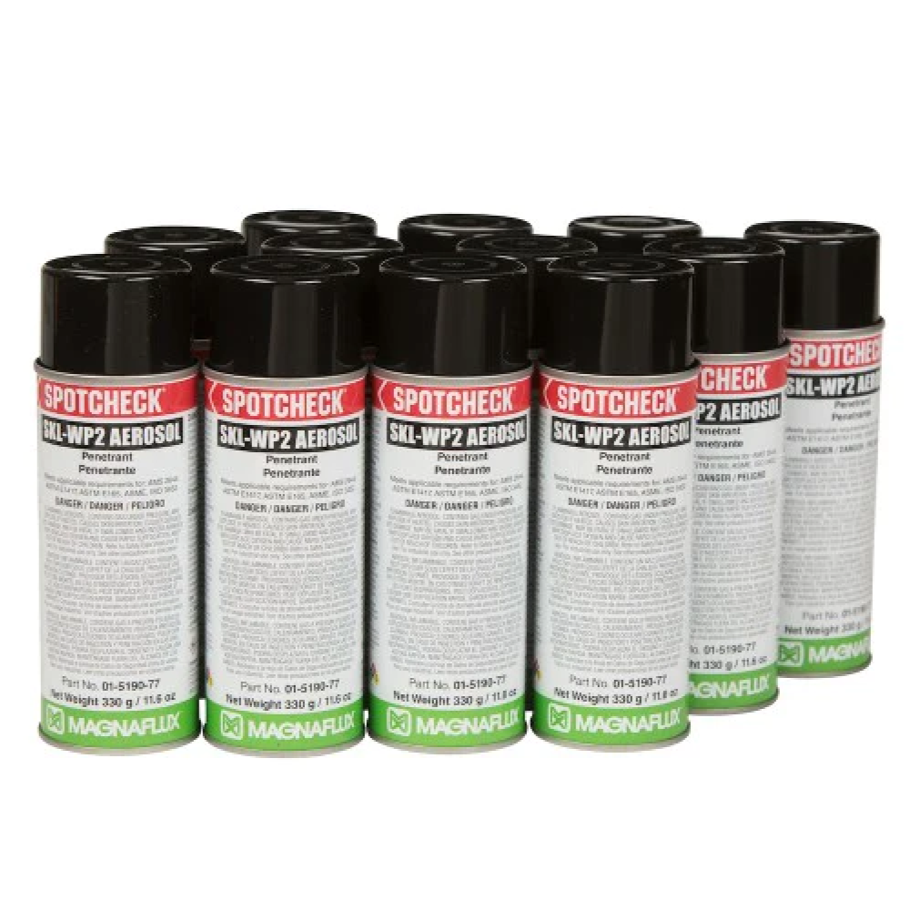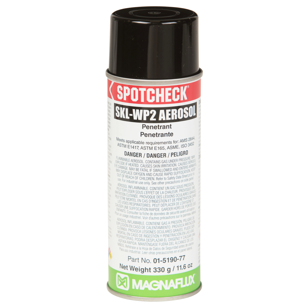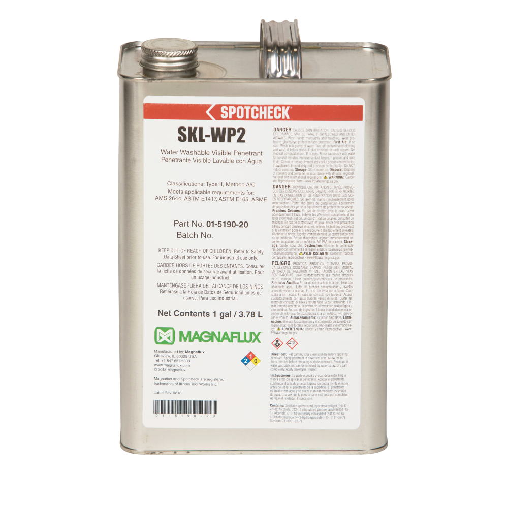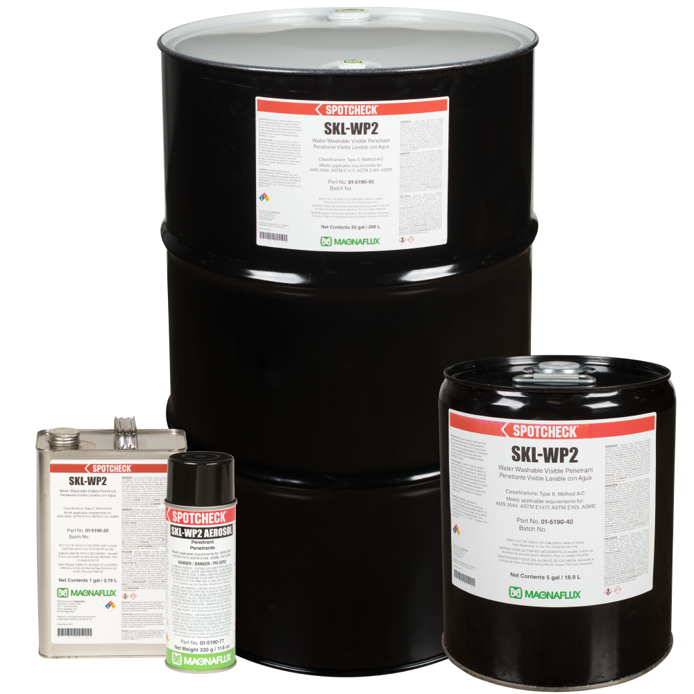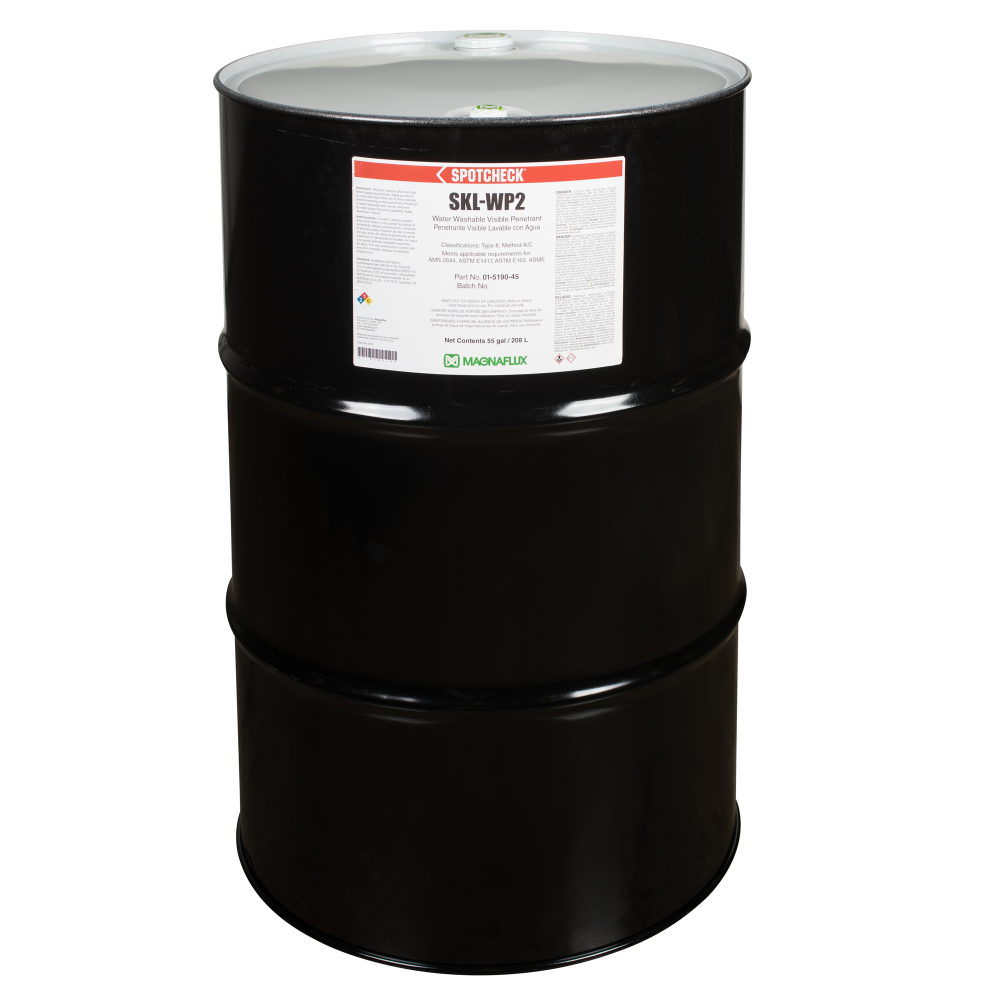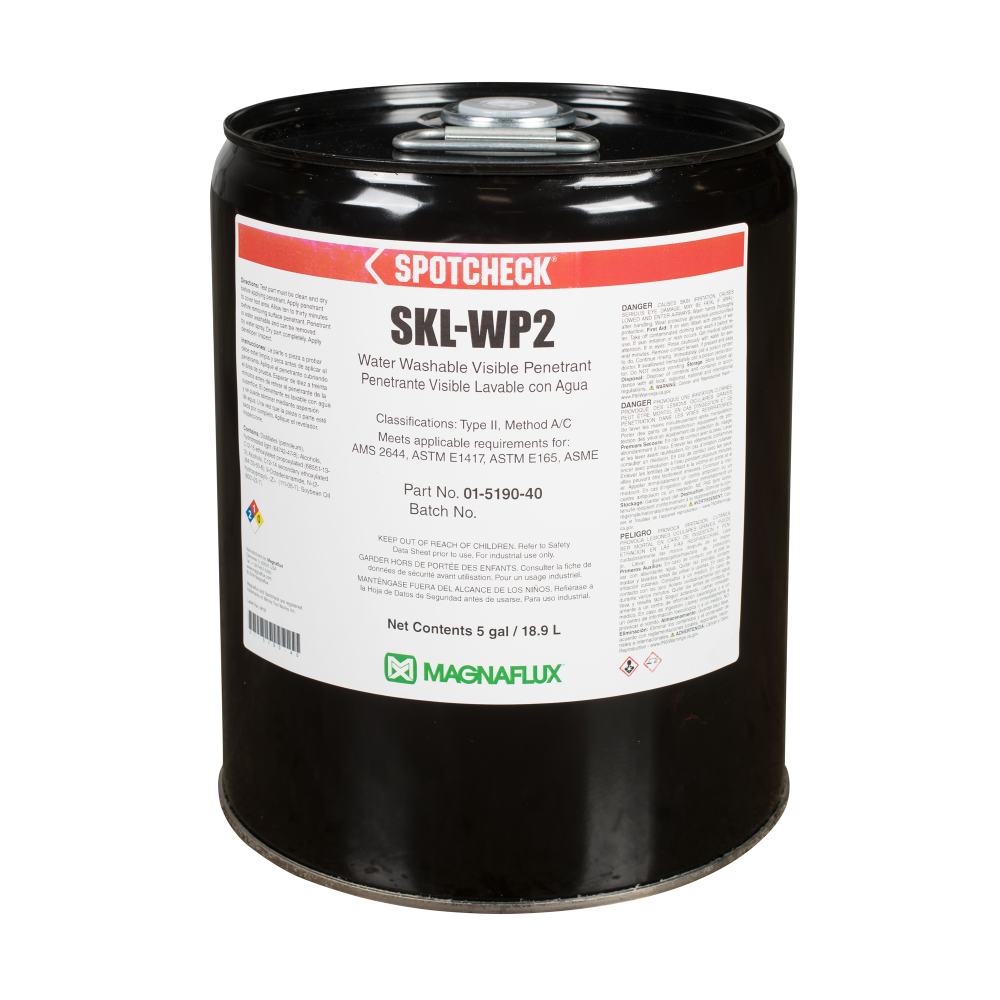Developed for large surface areas and rough surfaces where excess penetrant is difficult to remove with a solvent removable cleaner or emulsifier, SKL-WP2 is a water-removeable dye penetrant for Type 2 penetrant testing in visible white light.