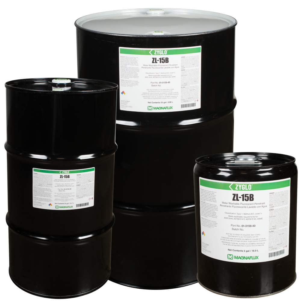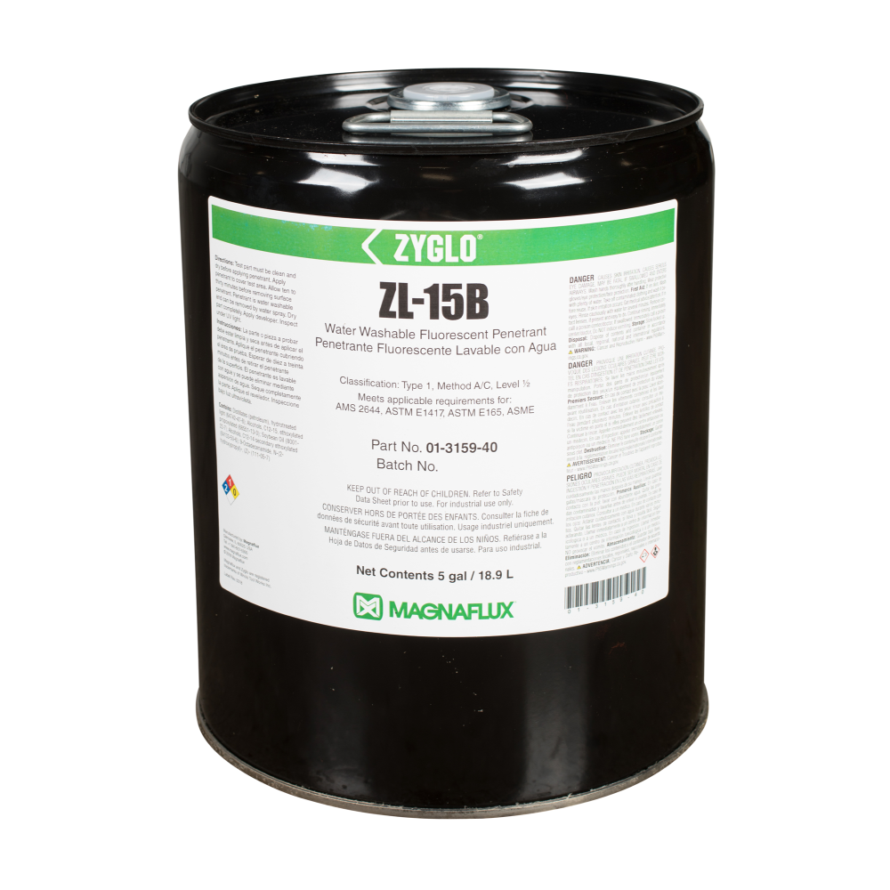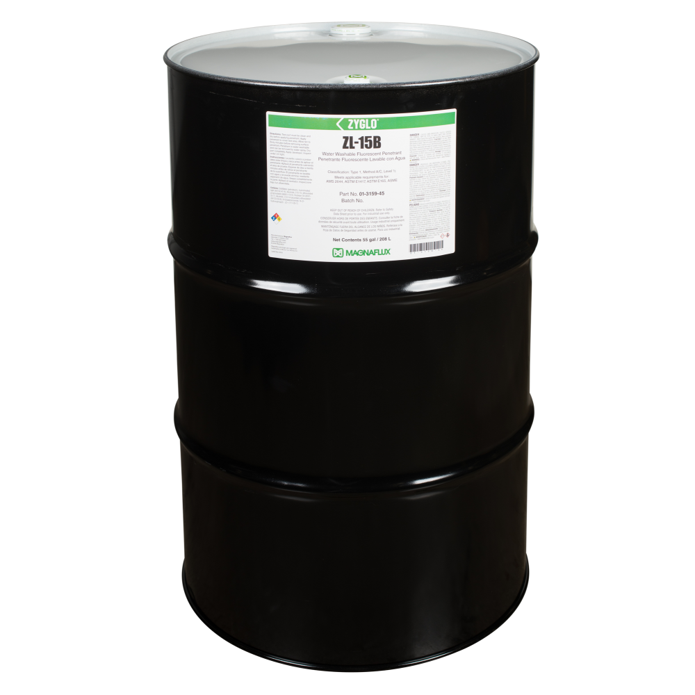 ZL-15B water washable penetrant is a low-sensitivity penetrant that features excellent washability. It is used to find open surface flaws such as cracks and porosity in seams, laps, cold shuts, and laminations on castings, forgings, extrusions, and parts with rough surfaces.