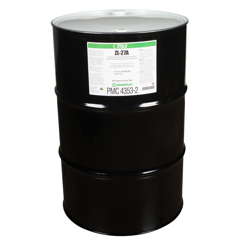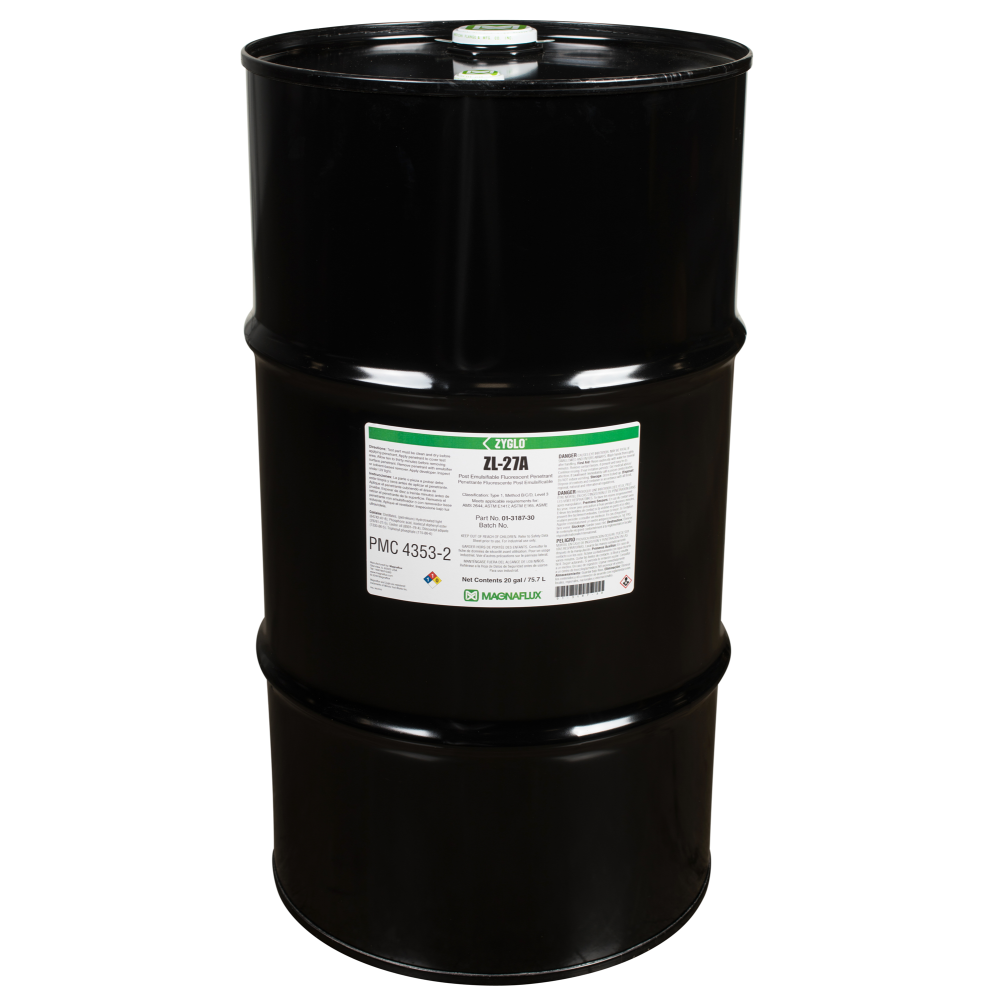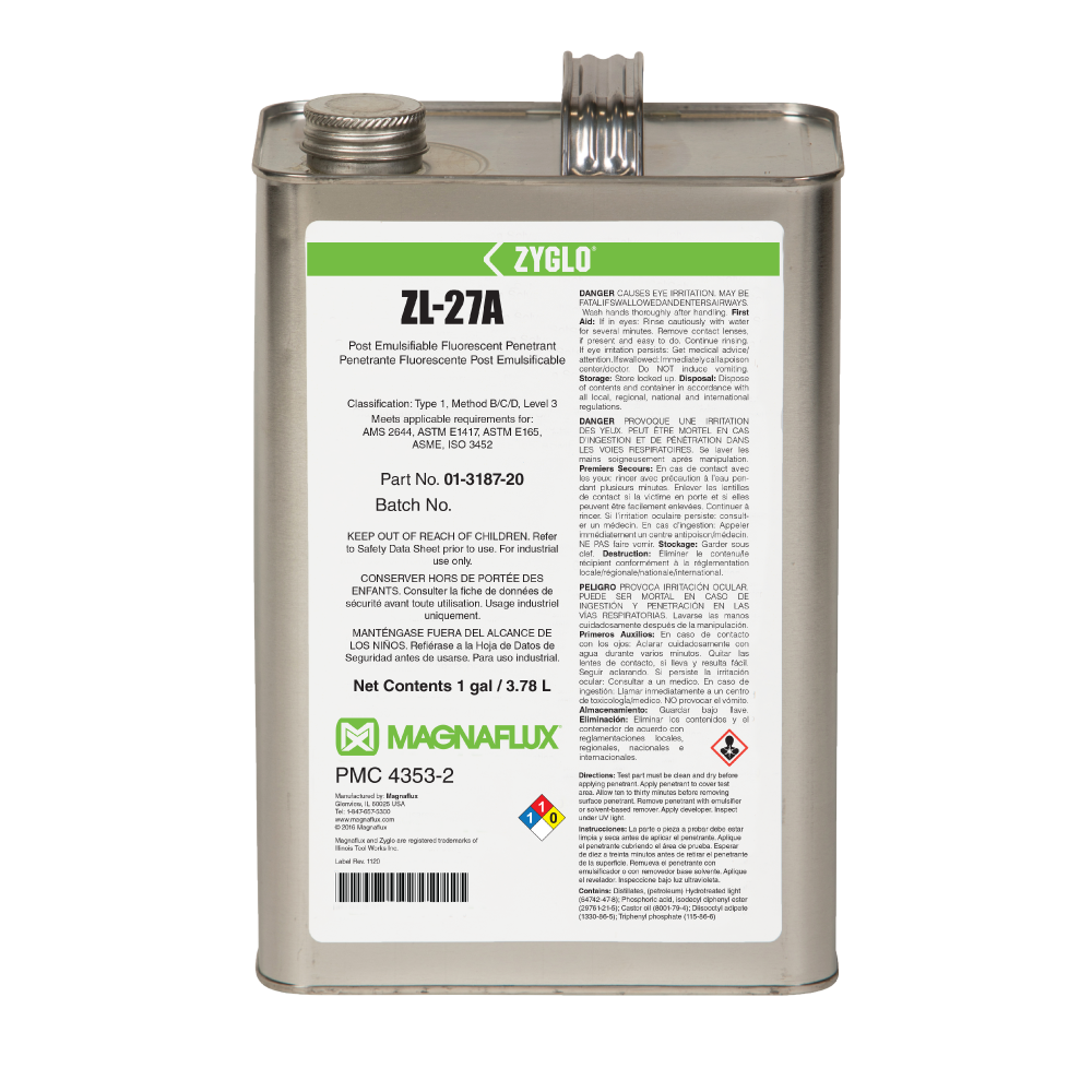 Post-emulsifiable ZL-27A is a Level 3, high-sensitivity Type 1 penetrant designed for inspections which require maximum process control and reliability, such as safety-critical aerospace testing. Since ZL-27A is not water soluble, there is minimal risk of this penetrant being removed from a fine or shallow defect through over-washing to provide the highest reliability of any penetrant inspection method.
