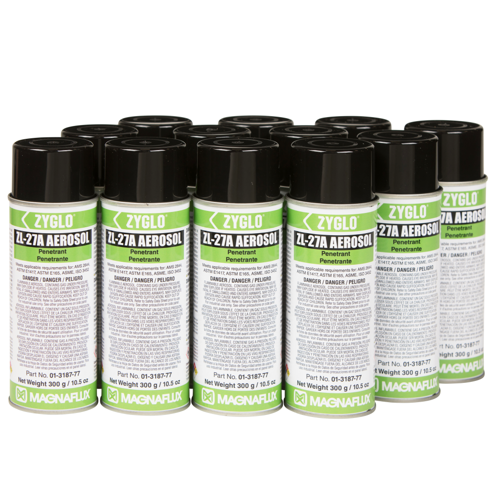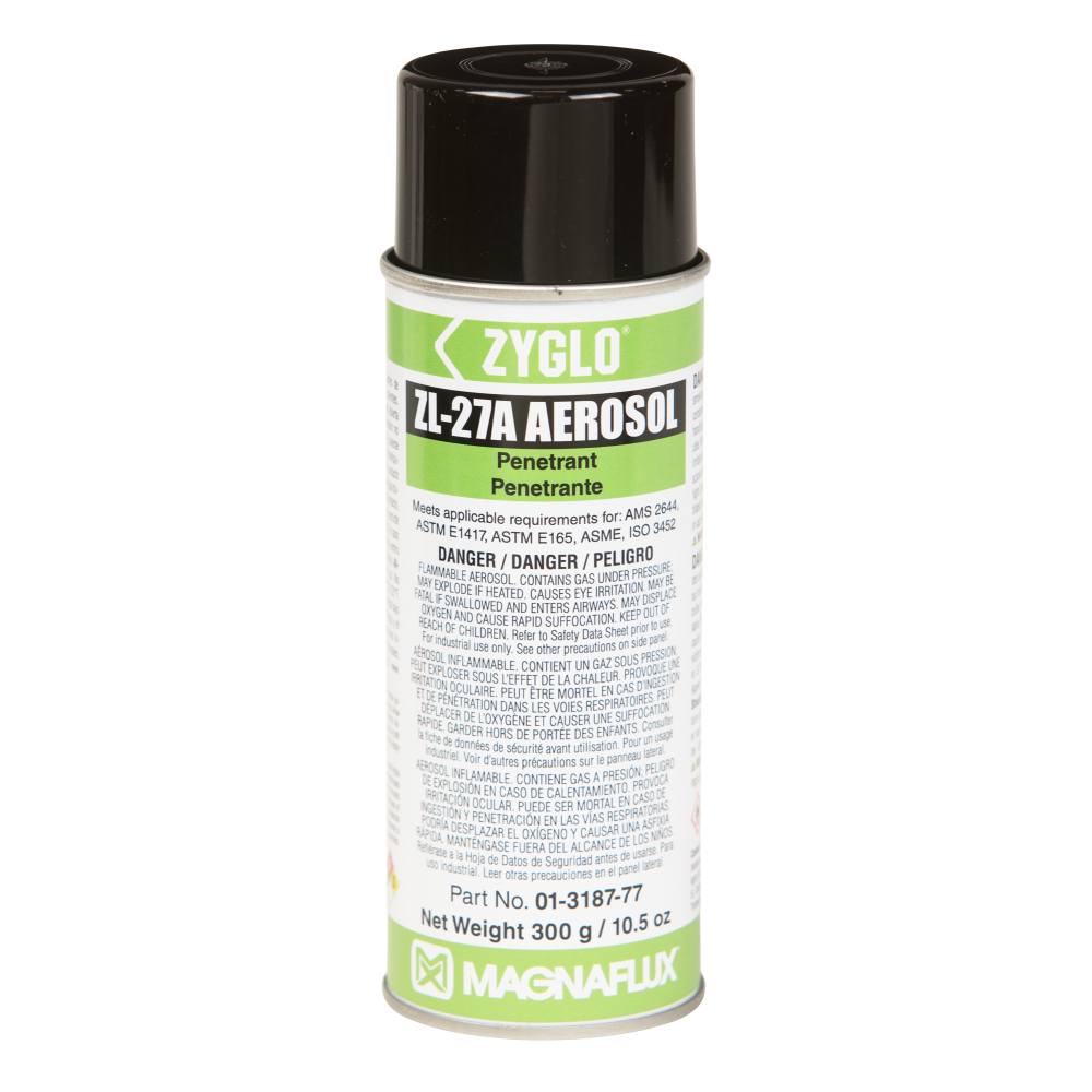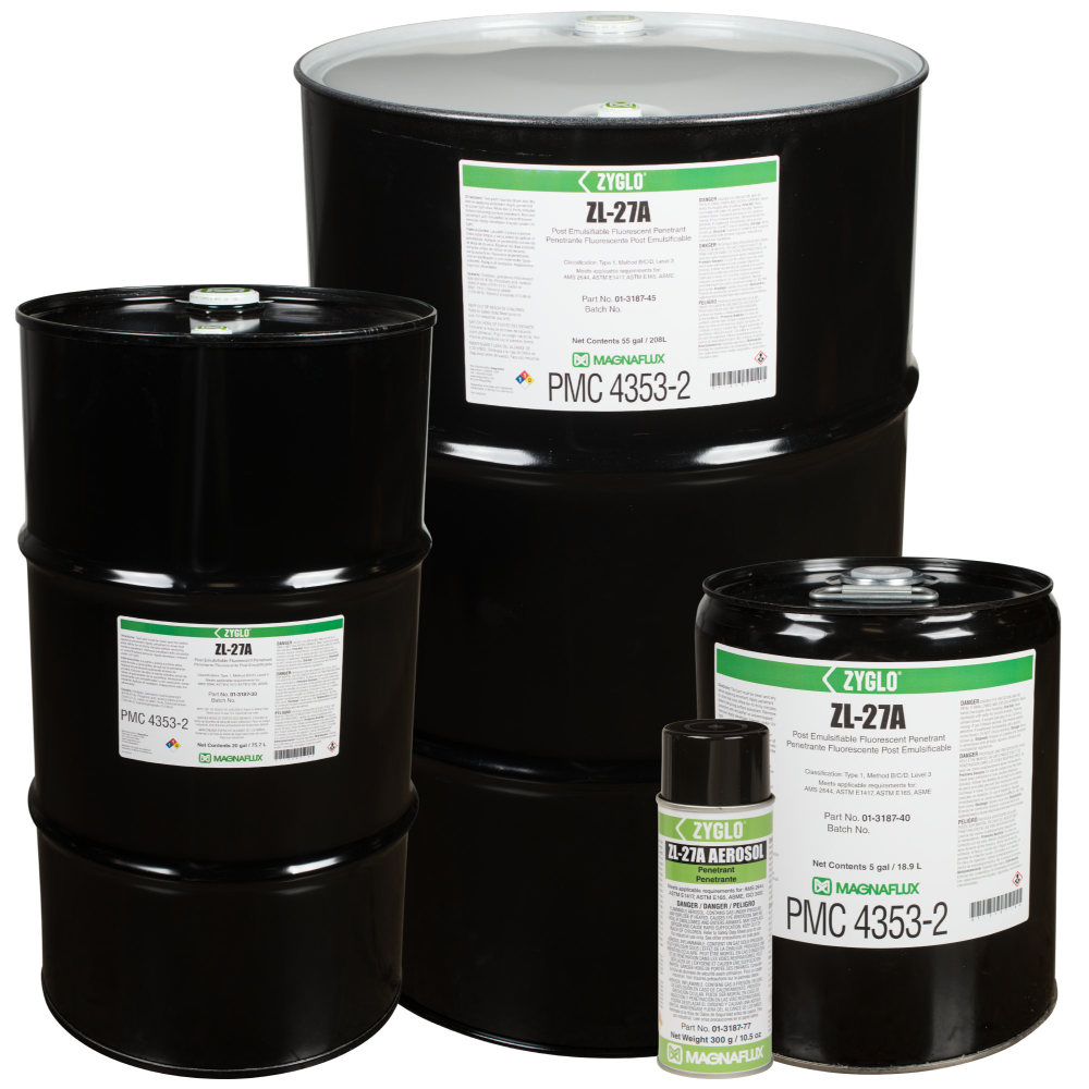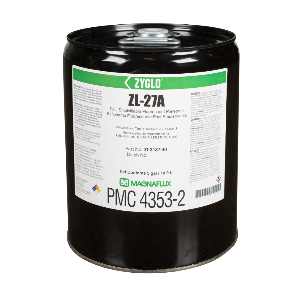 Post-emulsifiable ZL-27A is a Level 3, high-sensitivity Type 1 penetrant designed for inspections which require maximum process control and reliability, such as safety-critical aerospace testing. Since ZL-27A is not water soluble, there is minimal risk of this penetrant being removed from a fine or shallow defect through over-washing to provide the highest reliability of any penetrant inspection method.