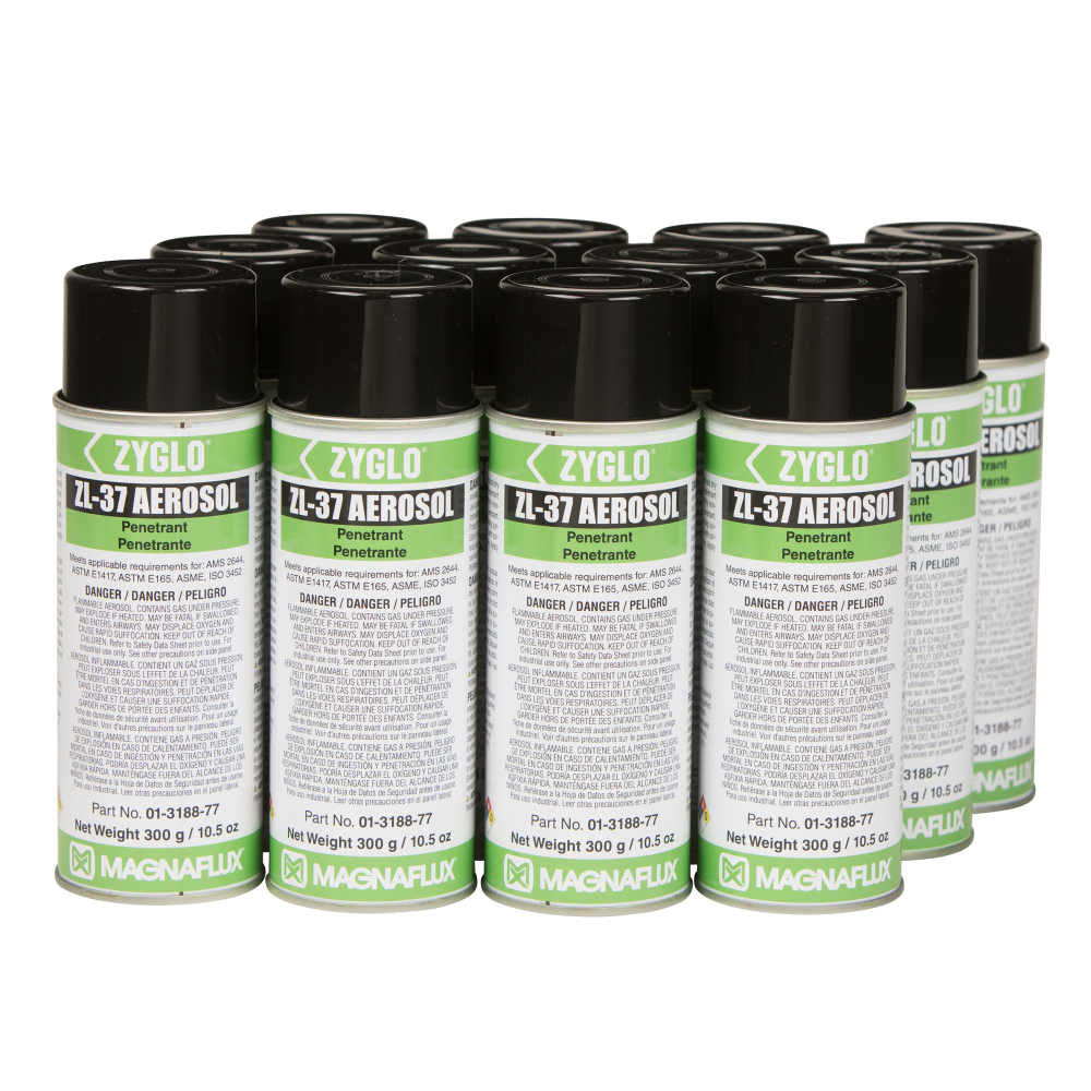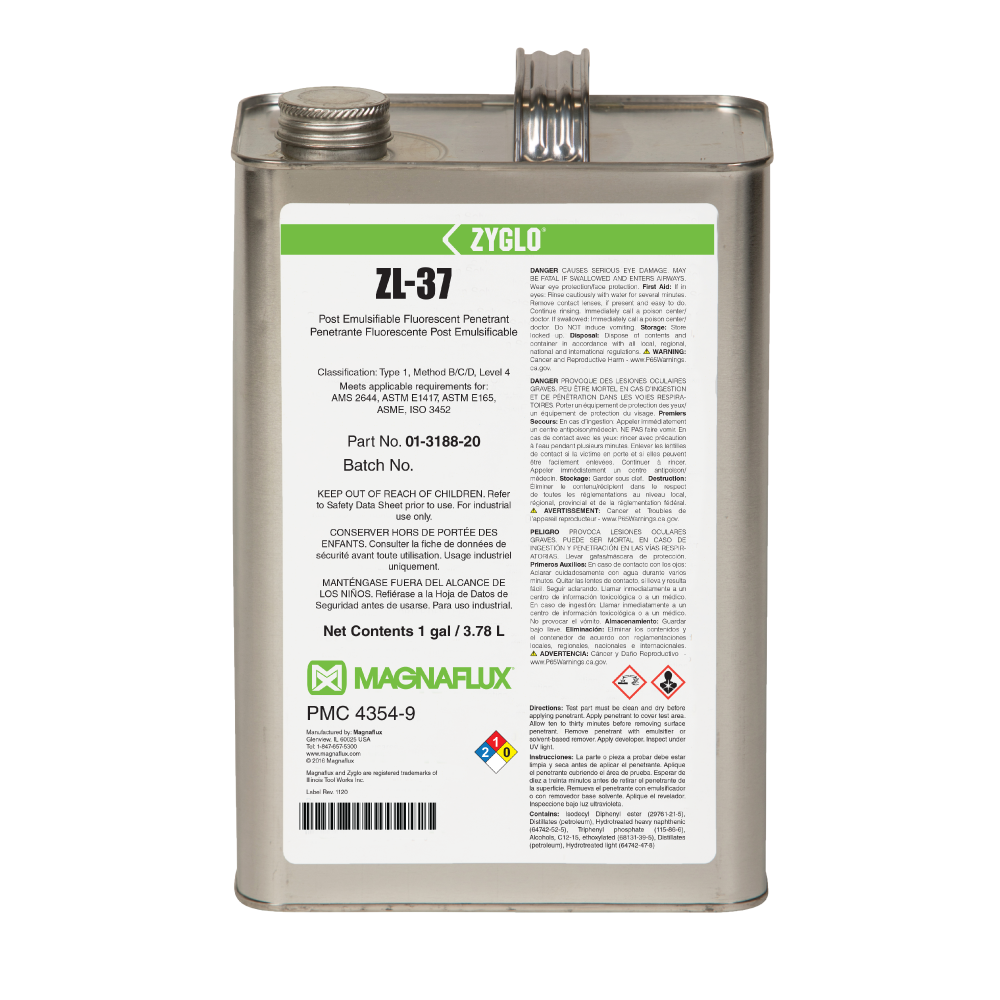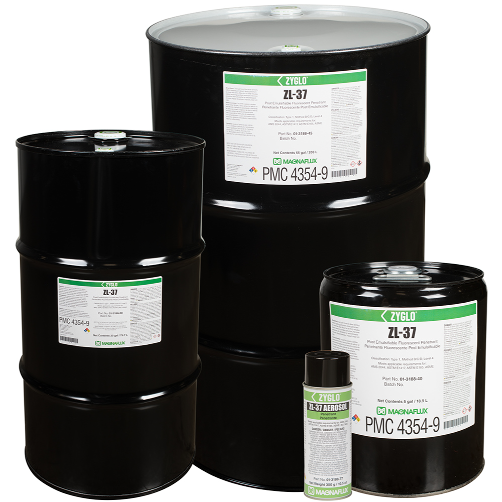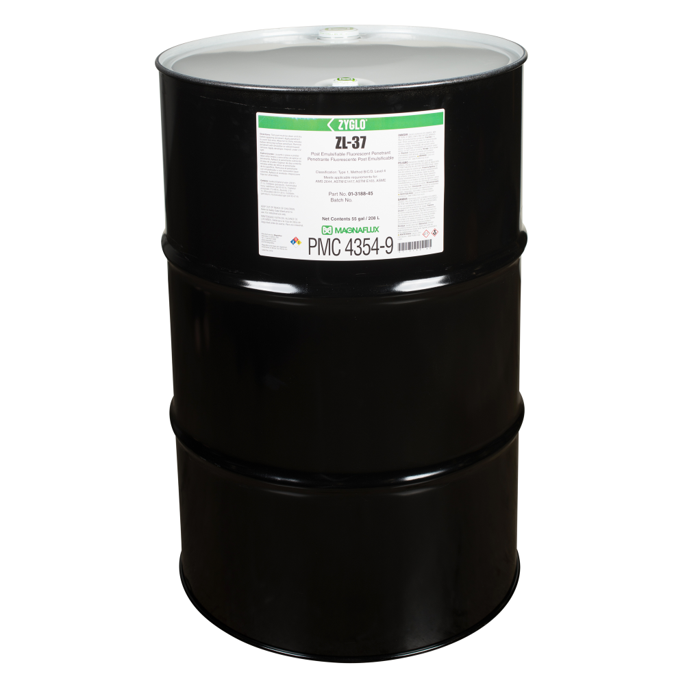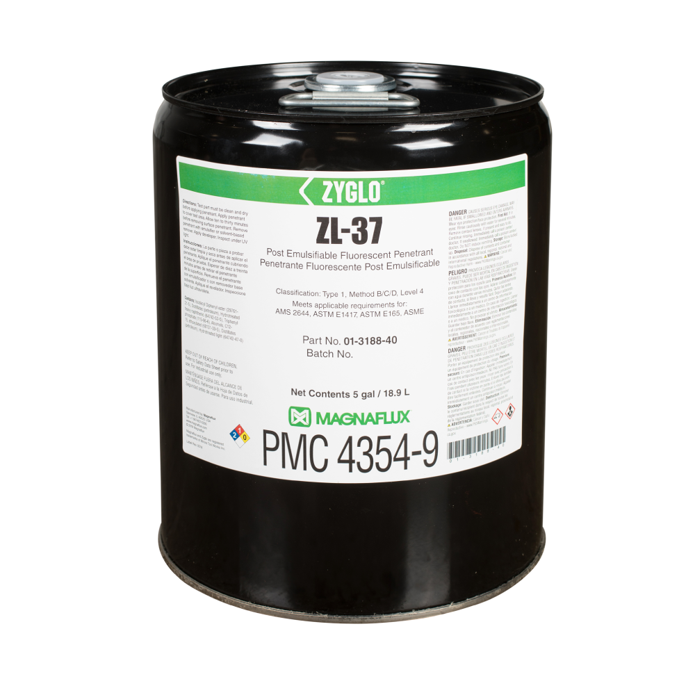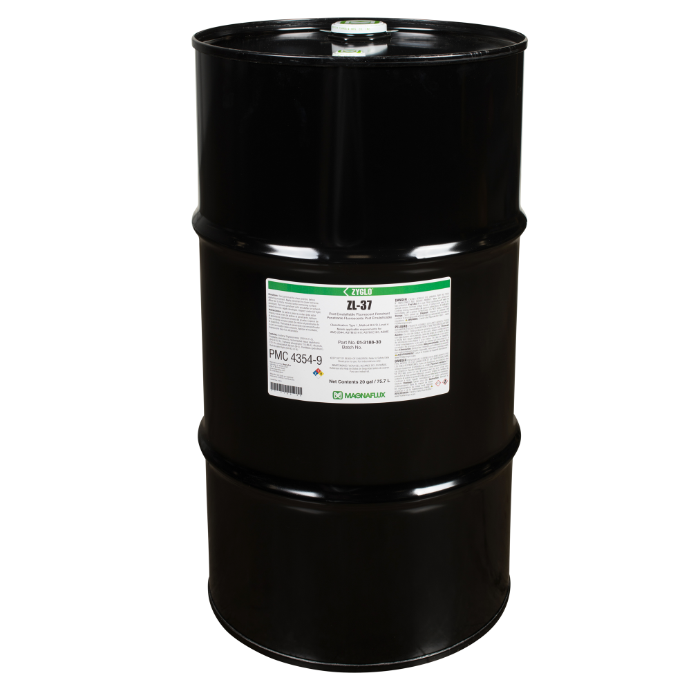 Essential for critical component applications, ultra-high sensitivity ZL-37 post-emulsifiable penetrant is designed for detecting fine, tight discontinuities in safety-critical components, such as titanium turbine components, and in high-stress parts, such as investment castings.