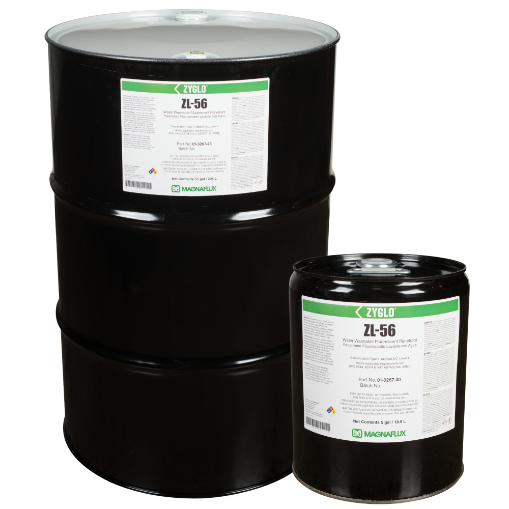 An ultra-high sensitivity penetrant (Level 4), ZL-56 fluorescent water-washable penetrant is safe for use on alloys in engineering and aerospace use, including aluminum, steel, nickel and titanium. ZL-56 is designed for non-porous and highly machined components. Developers recommended are ZP-4D powder, ZP-9F non-aqueous, SKD-S2 non-aqueous and ZP-5B water suspendible.