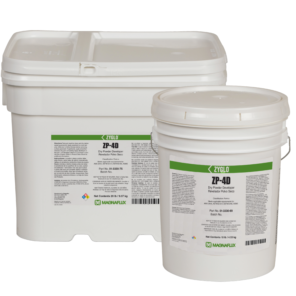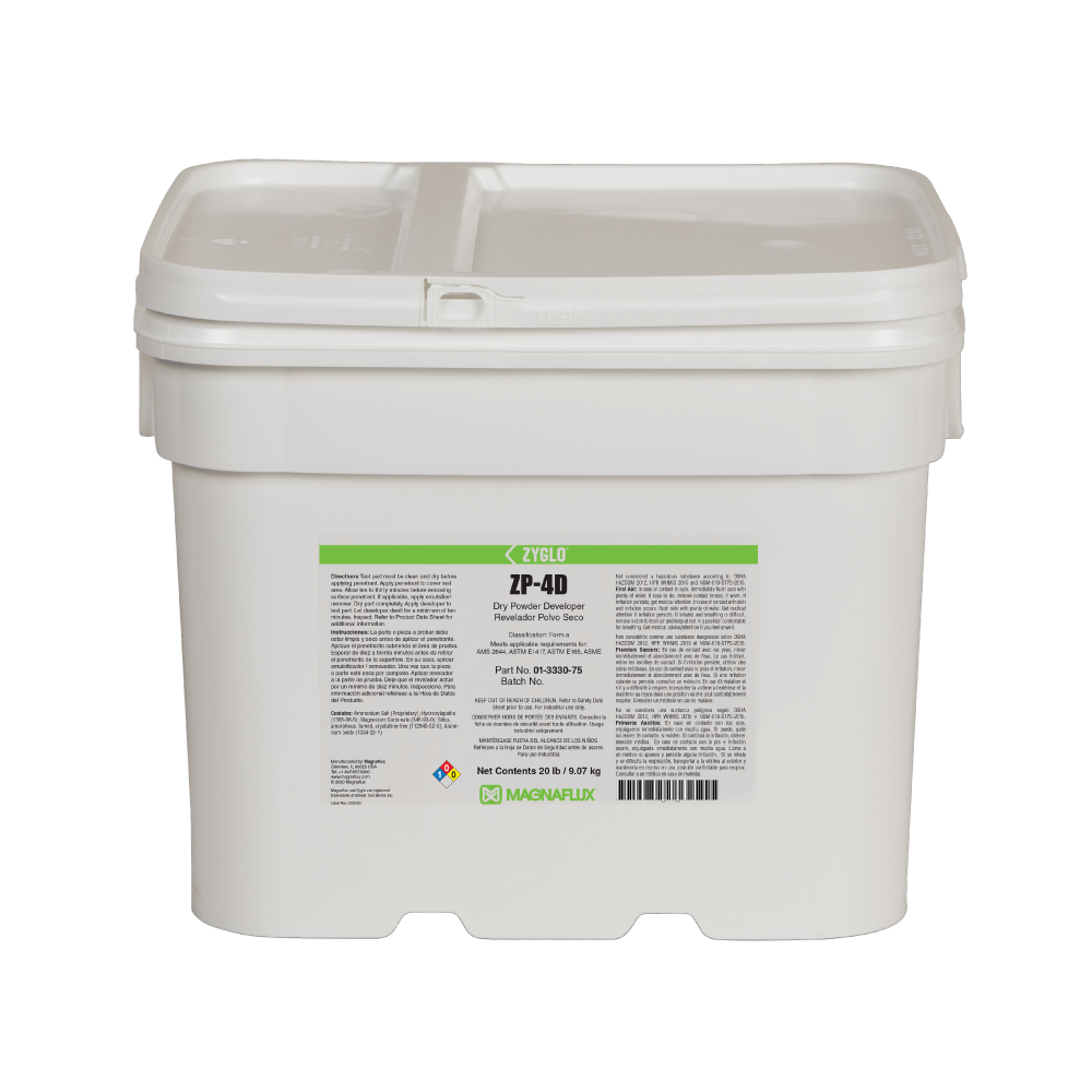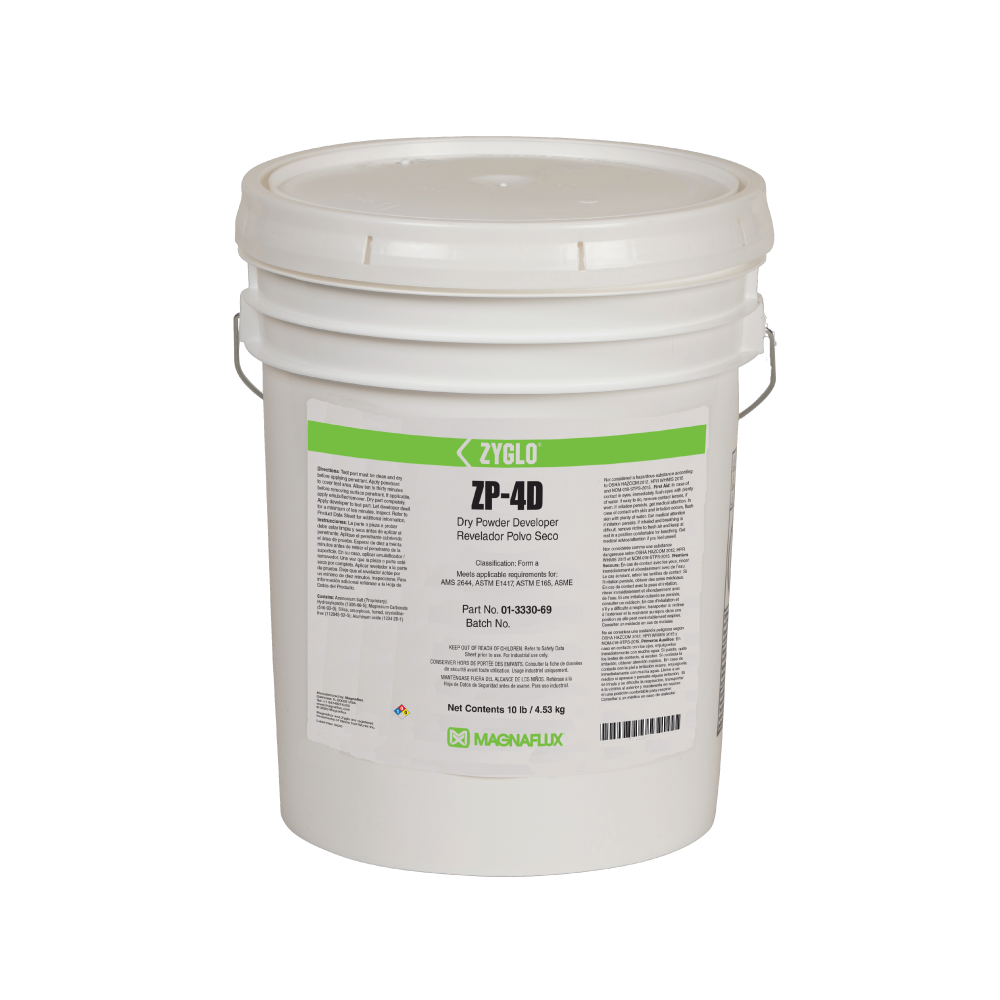 ZP-4D is a noncombustible dry powder developer for form A penetrant testing that is ideal for highly sensitive fluorescent penetrant processes. ZP-4D is applied to oven dried parts following the use of penetrants and forms a thin film on parts that enhances the visibility of ultra-fine discontinuities.