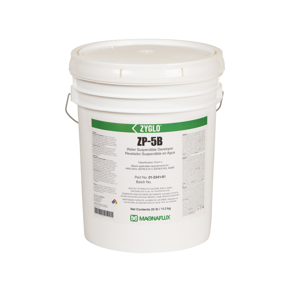 As a complementary developer for penetrant inspections, ZP-5B forms an opaque white coating that makes a contrasting background for indications. This white powder developer is mixed with water for use and disperses quickly to form an opaque white suspension, but must be continually agitated during use to ensure uniformity of mix as developer will settle out on standing.